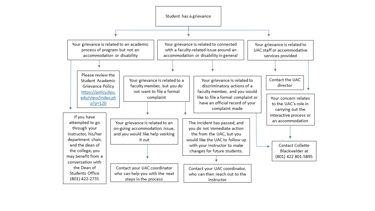 - For concerns about the implementation of academic accommodations, contact your Accessibility Center coordinator at (801) 422-2767